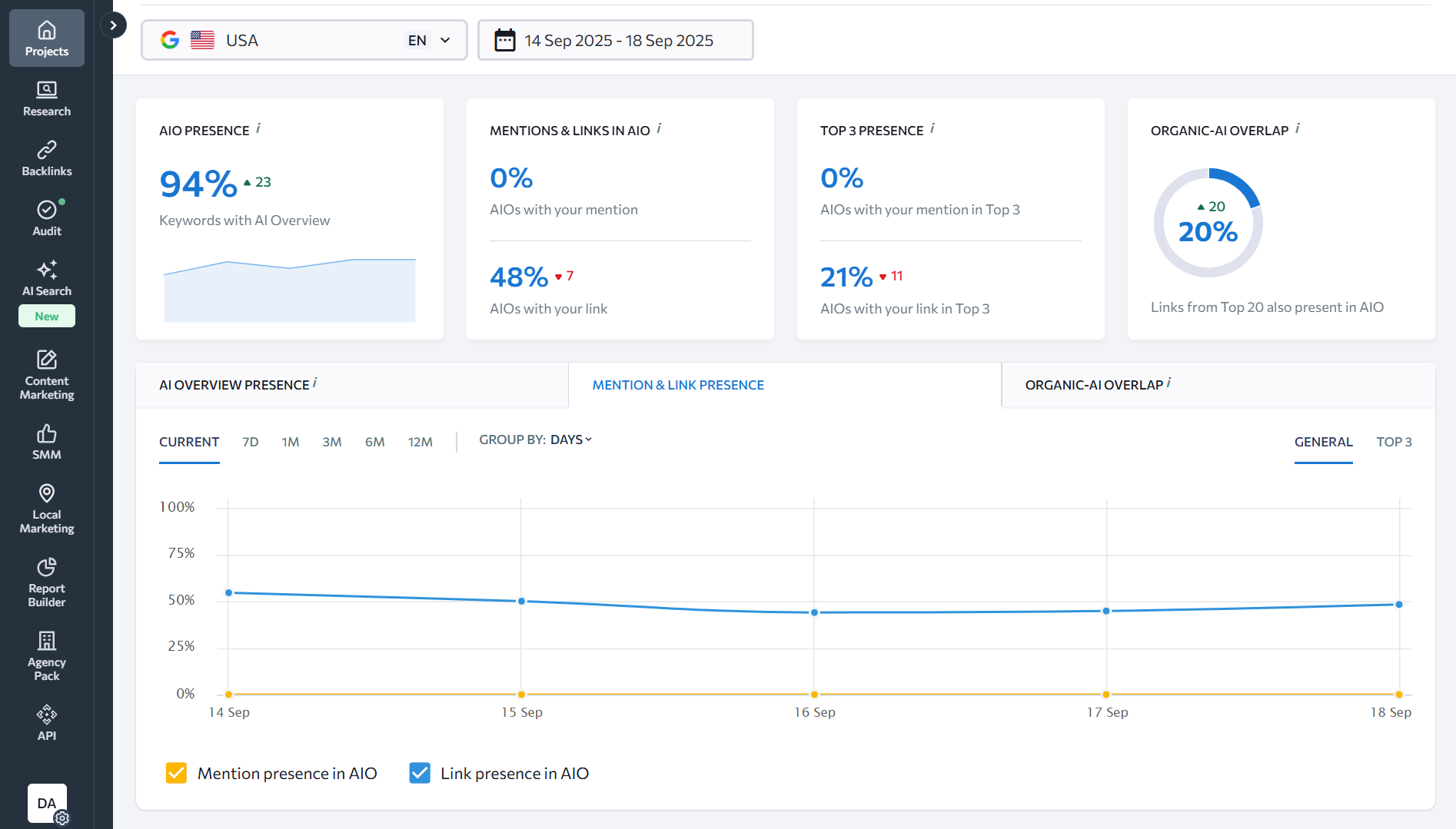 Among these is the Google AI Overview tracker, which shows whether your website is ranking in AIOs, along with metrics such as your overall AIO presence percentage, the share of mentions or links in AIOs, how often you're cited in the top three, and for exactly which keywords.