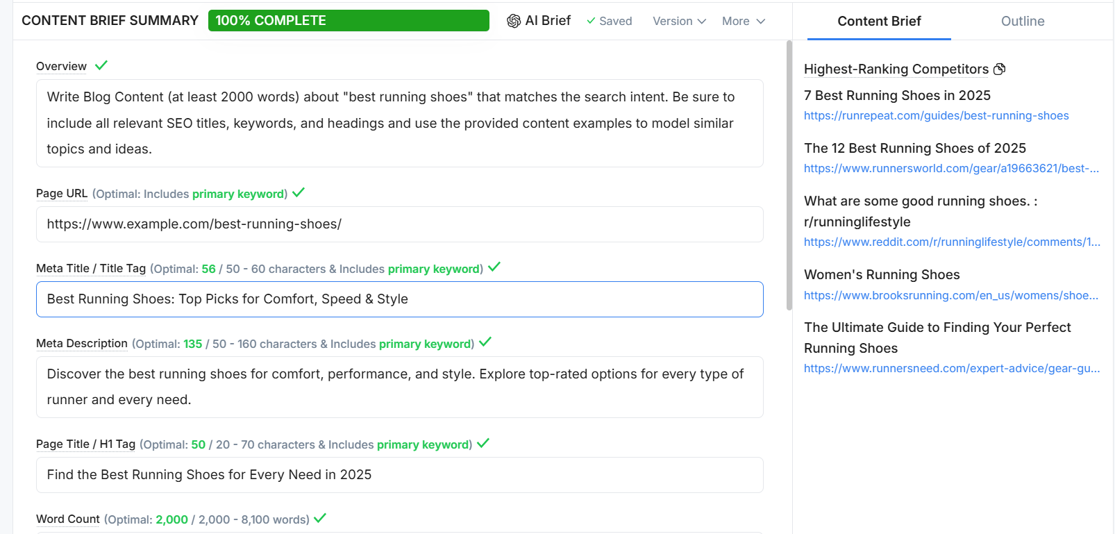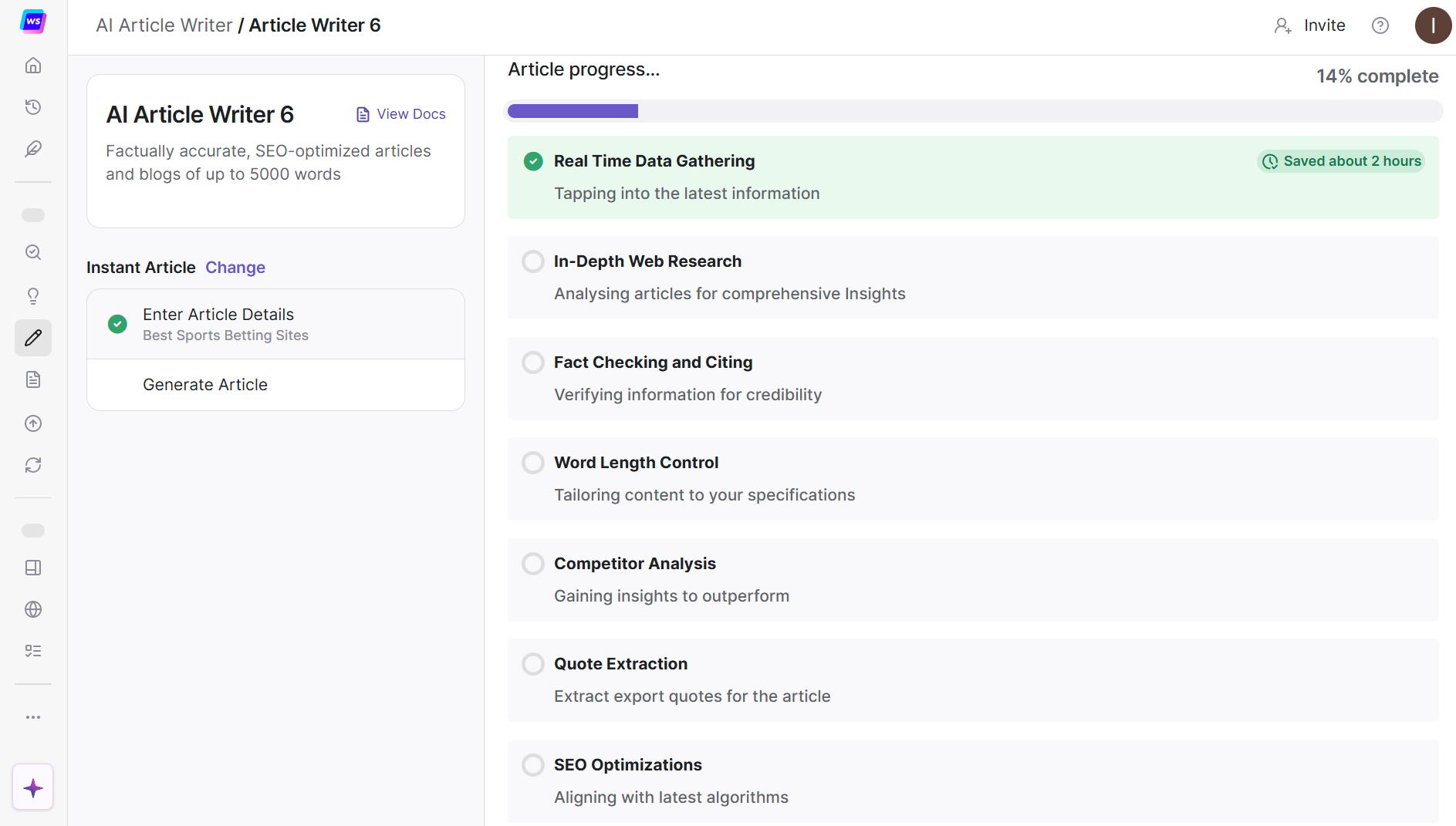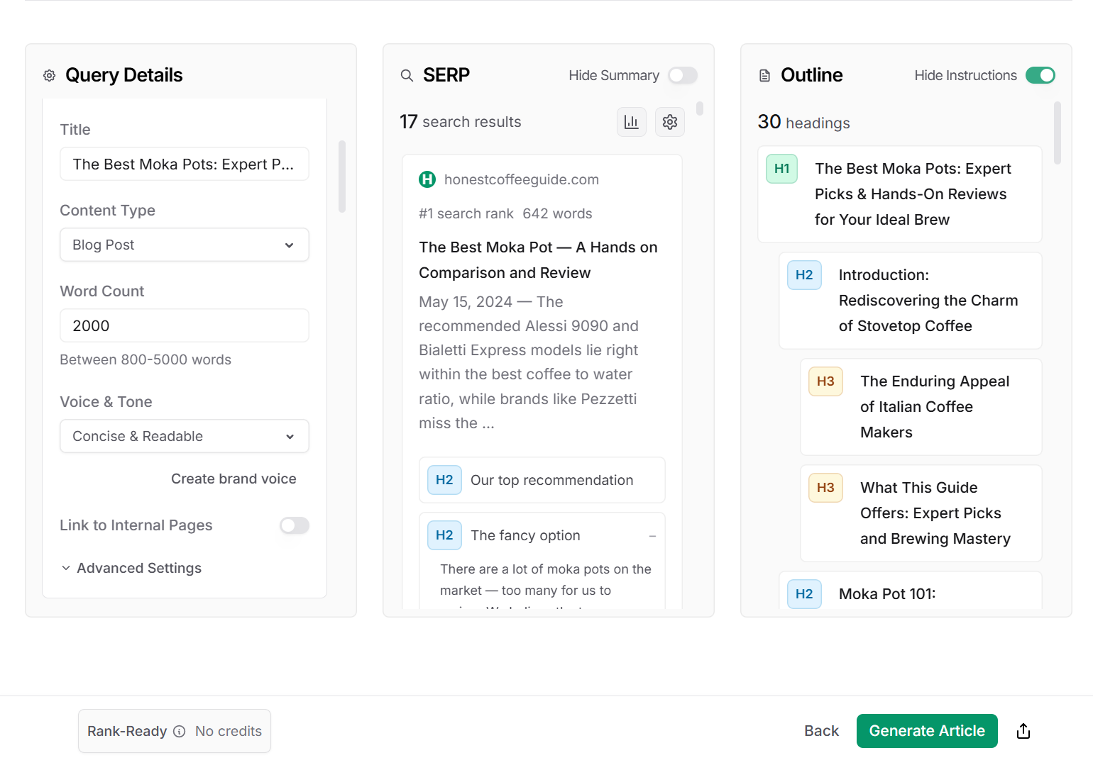 There are two ways you can approach this: you can provide a step-by-step of how you want the article structured, which competitors to reference, and the writing style to use. Or, you can give a simple breakdown with just the topic, research method, and article type, then let the tool handle the rest.