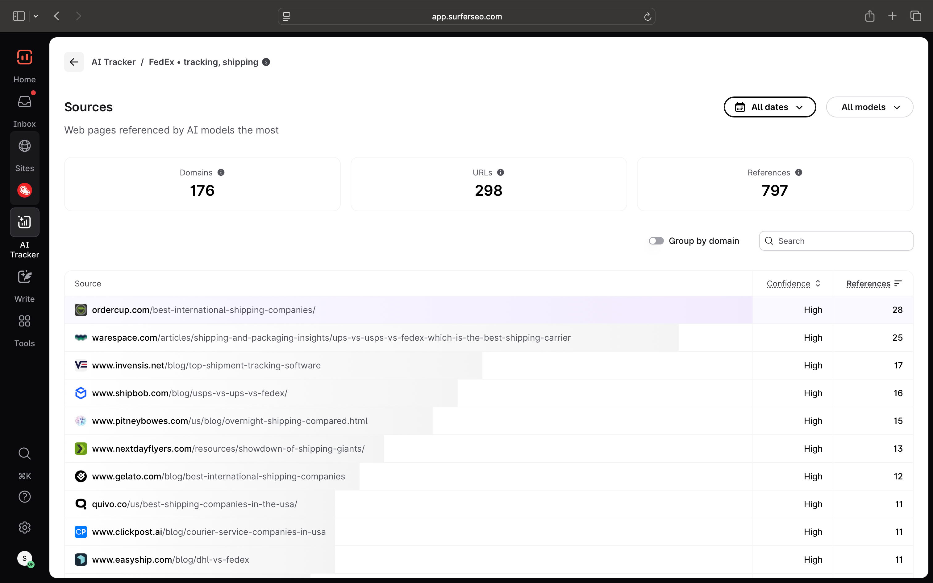 Surfer's AI Tracker also helps you track your visibility in AI generated results in 3 ways.