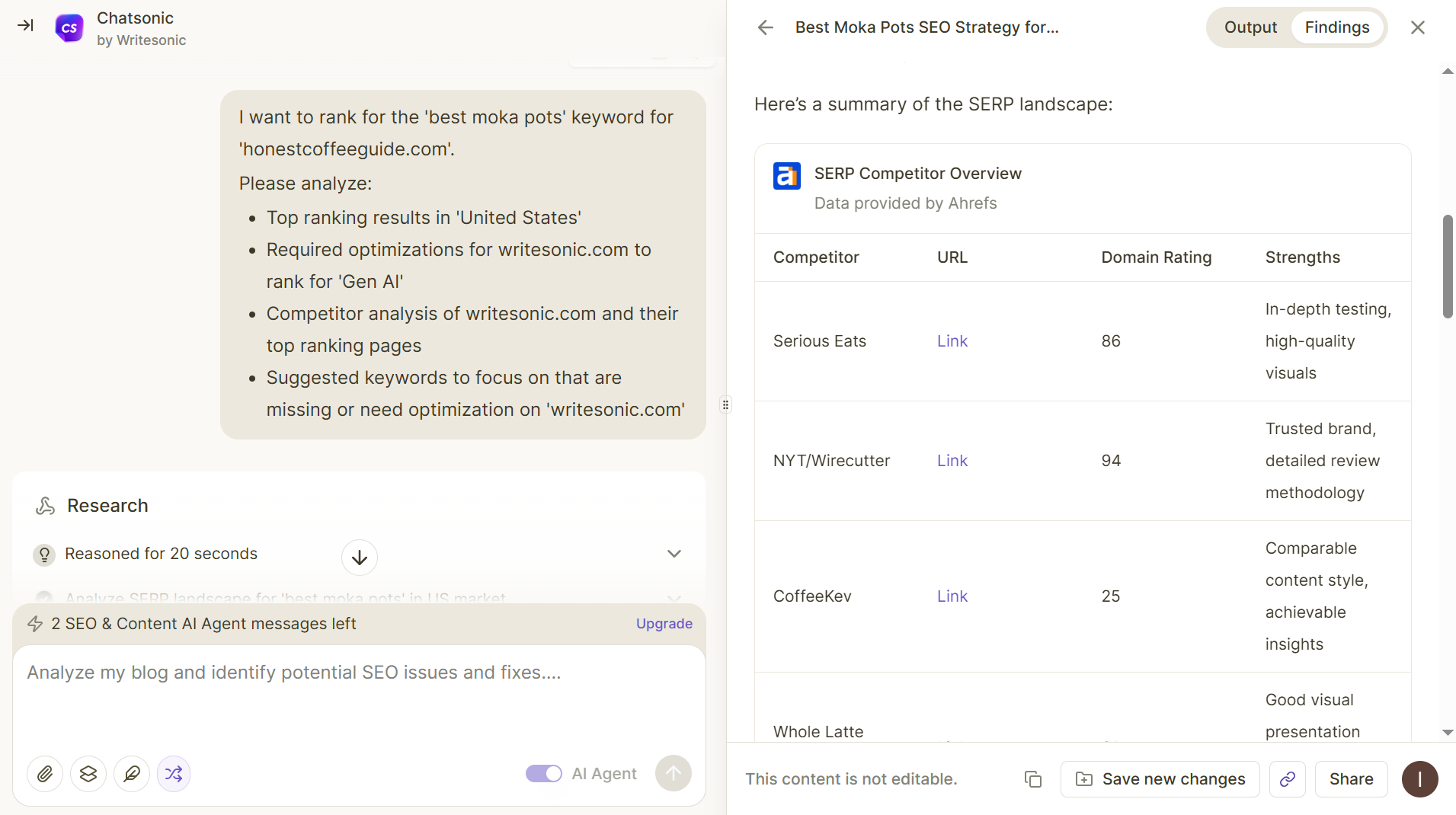 It then uses Ahrefs (or another tool of your choice) to identify top-ranking pages, run competitor research, and build topic clusters using Writesonic’s other features. The result is a complete content strategy, including a breakdown of the current SERP overview for the keyword, supporting content clusters to target, and more.