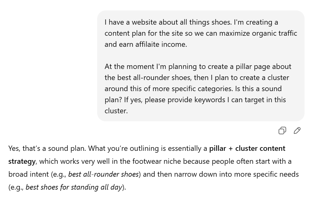 If you only have a rough idea of the content strategy you want to use, ChatGPT can help smooth out the edges and provide actionable insights on how to move forward. For example, here I asked the AI for advice on a hypothetical content strategy for a footwear affiliate site.
