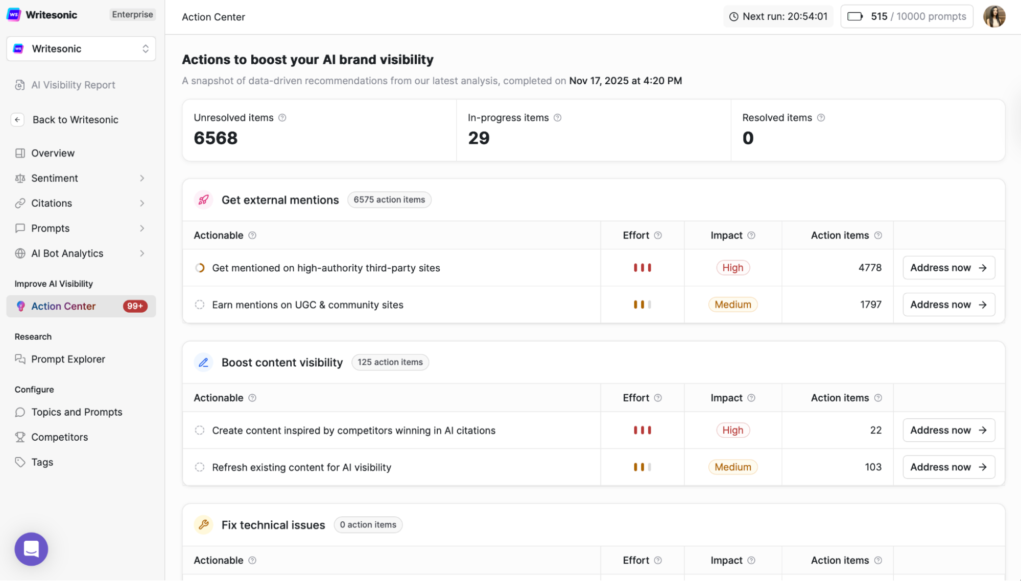 The Action Center turns those insights into concrete fixes, from content gaps and page updates to crawl accessibility issues and third-party outreach workflows, so teams can improve how models interpret and cite them—without leaving the platform.