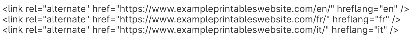 Let's assume your English printables website is translated into French and Italian. In this case, your hreflang tags would look like this: