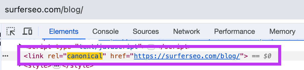 For a quick spot-check on any individual page, you can also open your browser's DevTools (right-click > Inspect > Elements), search the head section for "canonical," and verify the tag points to the URL you expect.