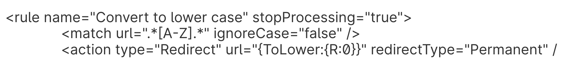 With this in mind, be extra careful when manually entering canonical URLs. Alternatively, you can implement server-side rules to enforce lowercase URLs across your website. Here's what the rule looks like: