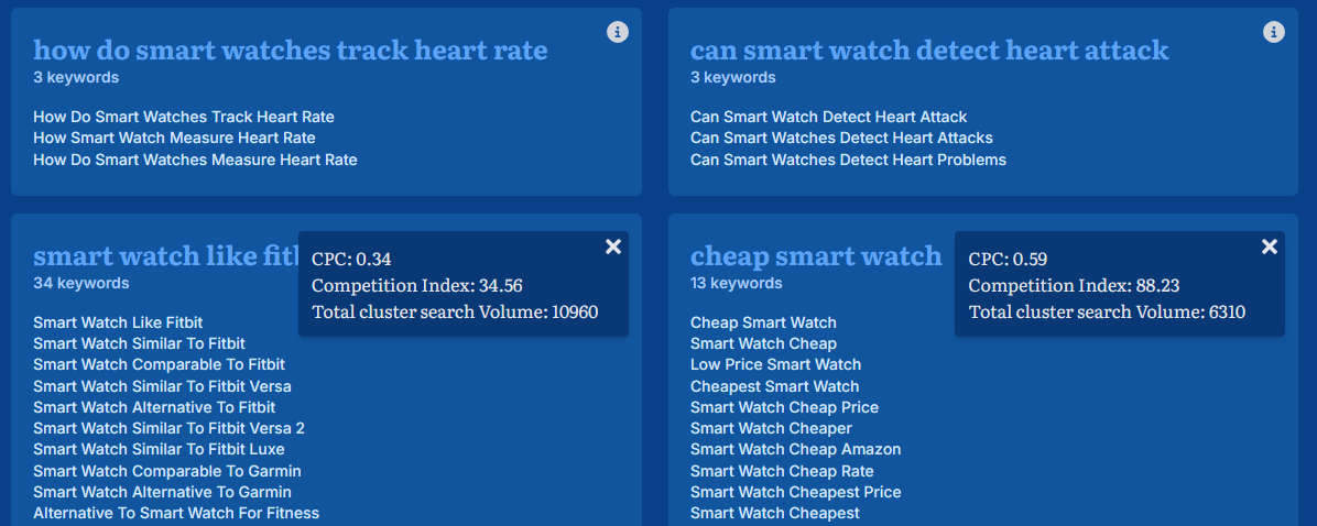 You can view the search volume, CPC, and competition index for each cluster on-screen. Or, download the CSV report to view this data for each cluster and individual keyword.