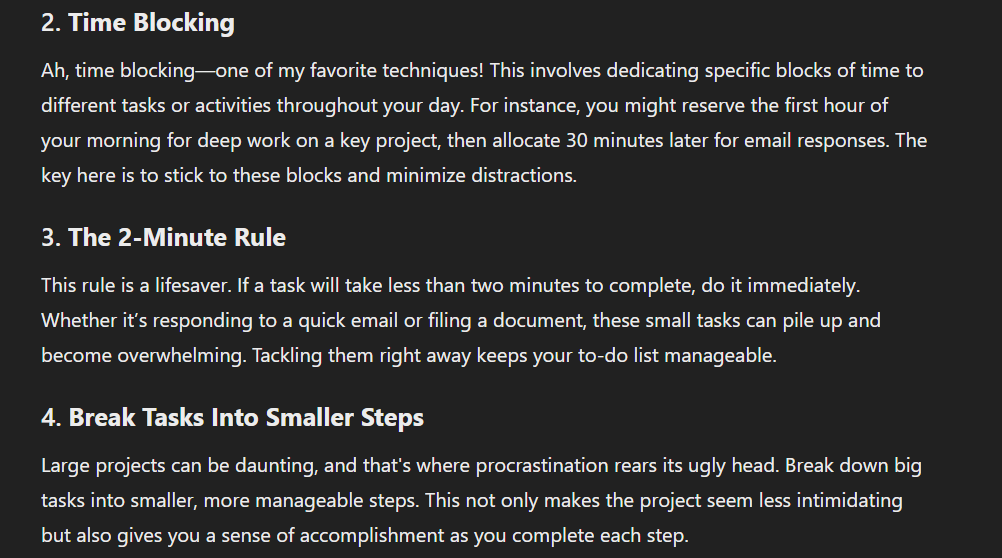No one likes reading through huge blocks of text. Break up AI-generated content into short paragraphs to keep your structure clean and scannable.