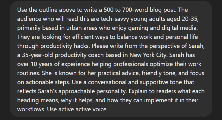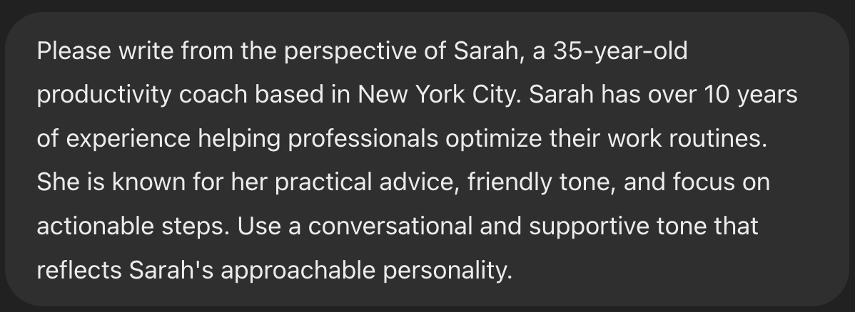 This practice is especially useful for making AI-generated content sound on-brand. If you have a brand persona set up, plug it into your prompts and the AI will write in a voice tailored to your ideal reader.