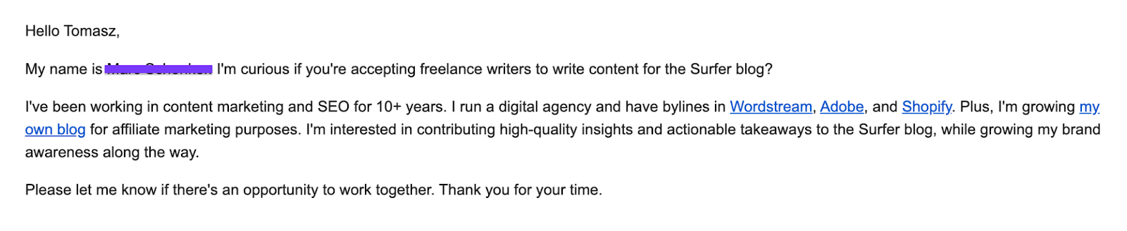 Here's an example of a guest posting pitch we received for the Surfer blog: