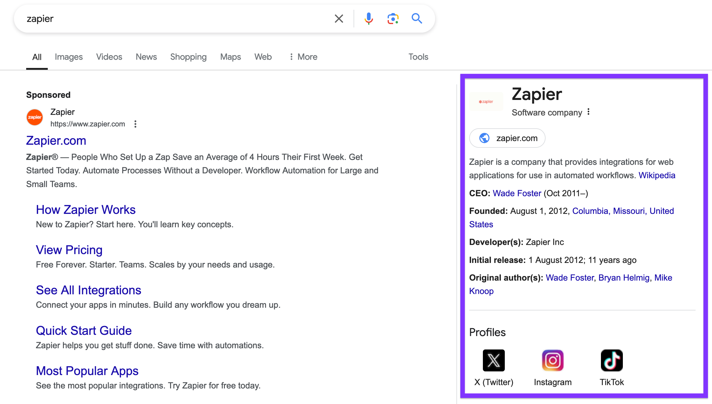 Speaking of rich results, there's a special type of result that many consider the pinnacle of authority—a Knowledge Panel. It's a concise summary of the searched topic or entity displayed on the right side of the search results page, like so: