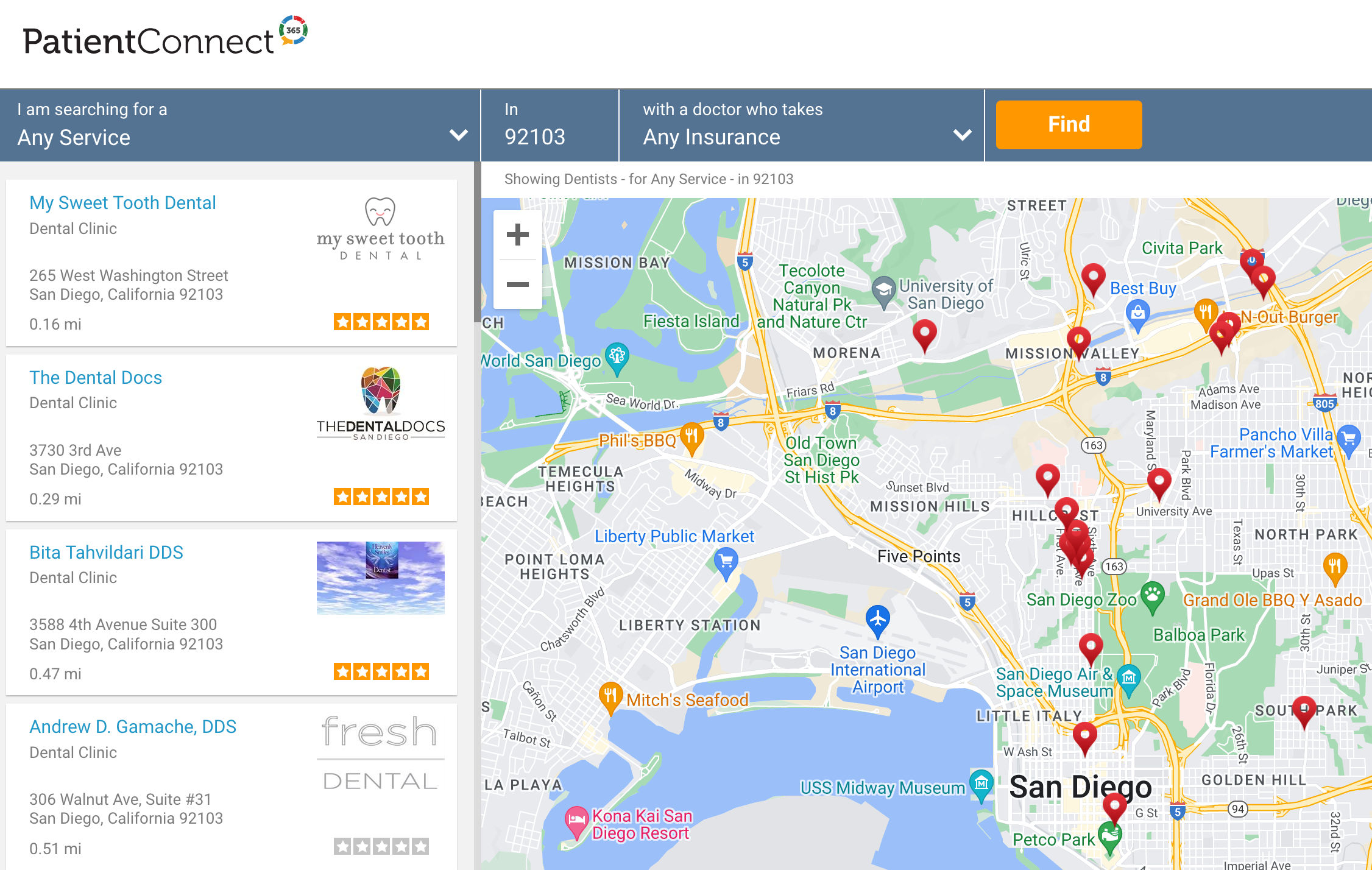 For example, if you search for dentists in San Diego, you'll see that PatientConnect365 offers such a directory.