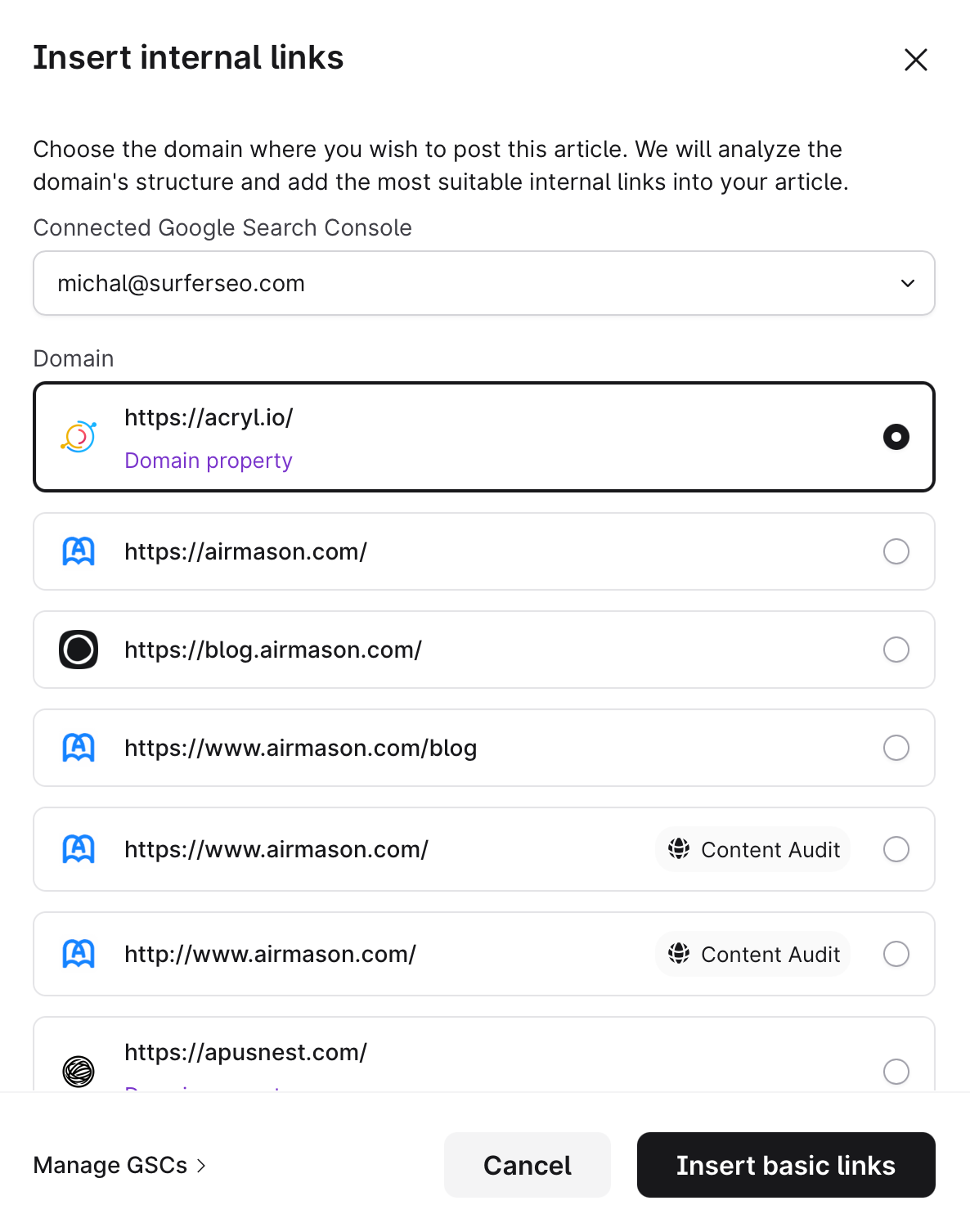 To speed this up, I use Surfer’s Insert internal links feature, which automatically suggests internal link opportunities that make sense in context. You can review and approve the suggestions directly in the interface.