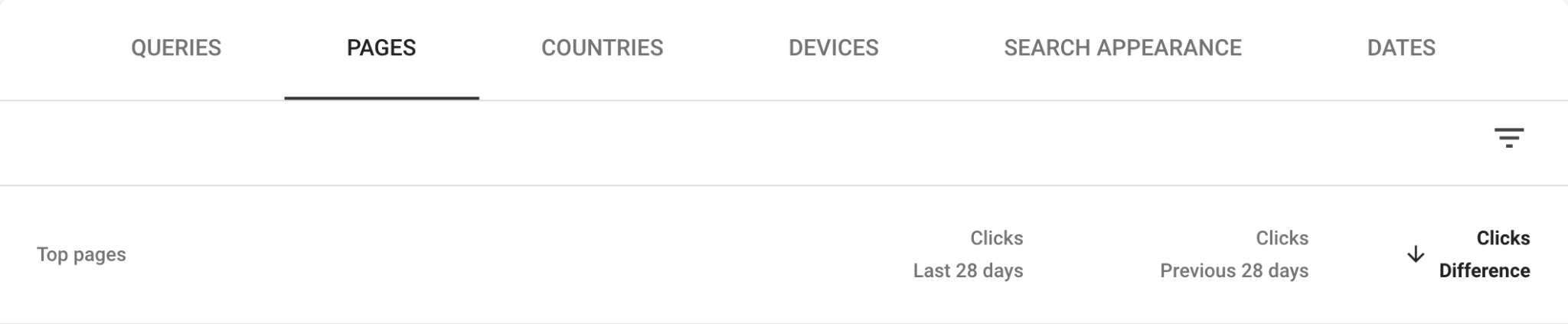 - With the Clicks metric enabled, sort by “Clicks difference” to see which pages have lost traffic recently. Those are your best candidates for a content refresh.