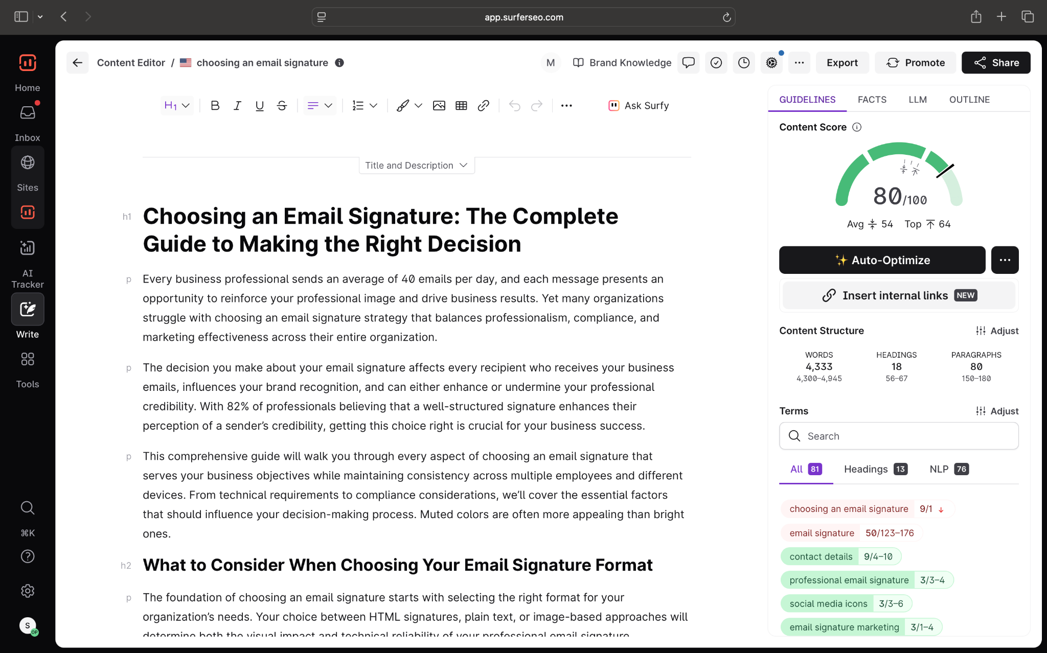 Using tools like Surfer AI, you can outline and draft SEO-optimized content based on real-time SERP data. It creates optimized content, including keywords, headings, and structure that top-ranking pages already use, so you’re not starting from scratch.
