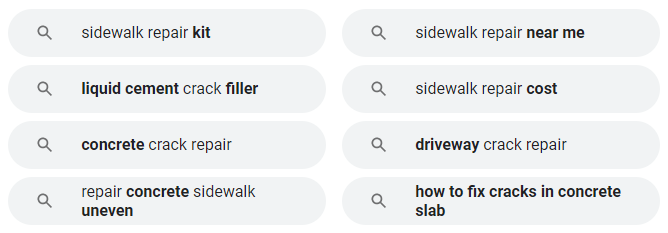 In our "sidewalk crack repair" example, Google tells us that related searches include both "sidewalk repair kit" and "driveway crack repair":