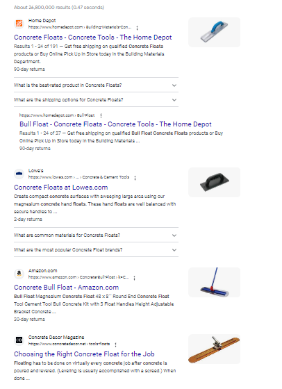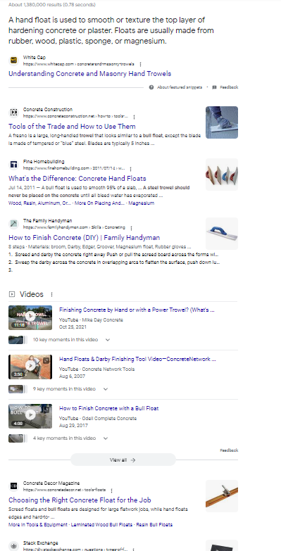 Taking our example of "concrete float vs trowel" from above, we see that the top results are focused on teaching people what these tools are and how to use them.