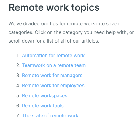 They have built their guide as a series of articles that all tackle a different aspect of remote work. This approach allows them to cover all the angles in depth while building on their already strong topical authority.