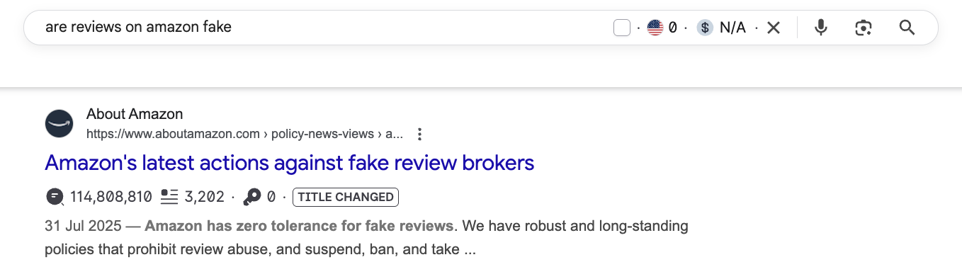 For example, Amazon knows it has a problem with fake reviews, and addresses it with a page that shows up when you search for this topic.