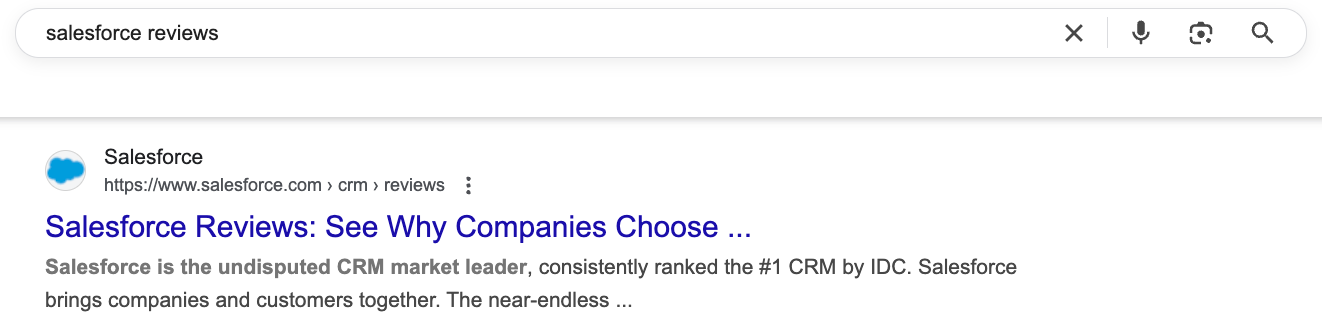 Salesforce is a perfect example of a well-executed PR content campaign. If you Google "salesforce reviews", you'll see the company's page at the top of SERPs.