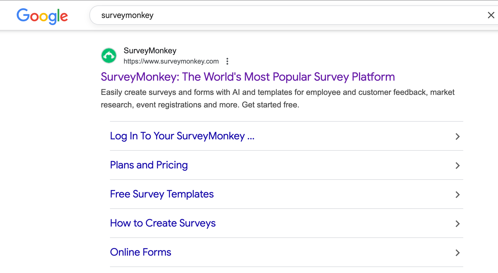 Take SurveyMonkey as an example. The home page's meta title positions the platform as the most popular survey platform, instantly creating a sense of trust and authority.