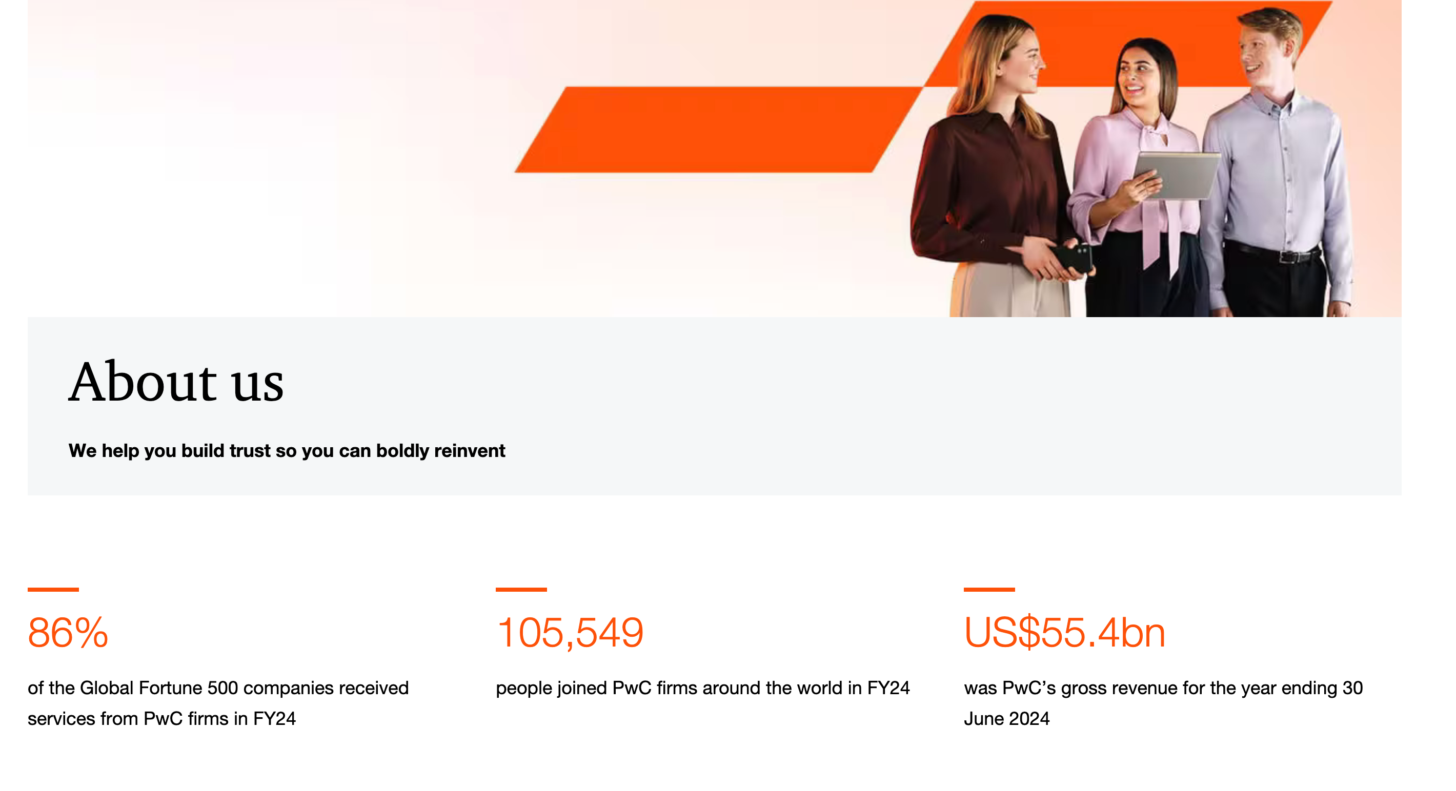 Besides these essentials, highlight any trust signals relevant to your brand and industry. For example, PwC highlights their work with Fortune 500 companies, team growth, and gross revenue.