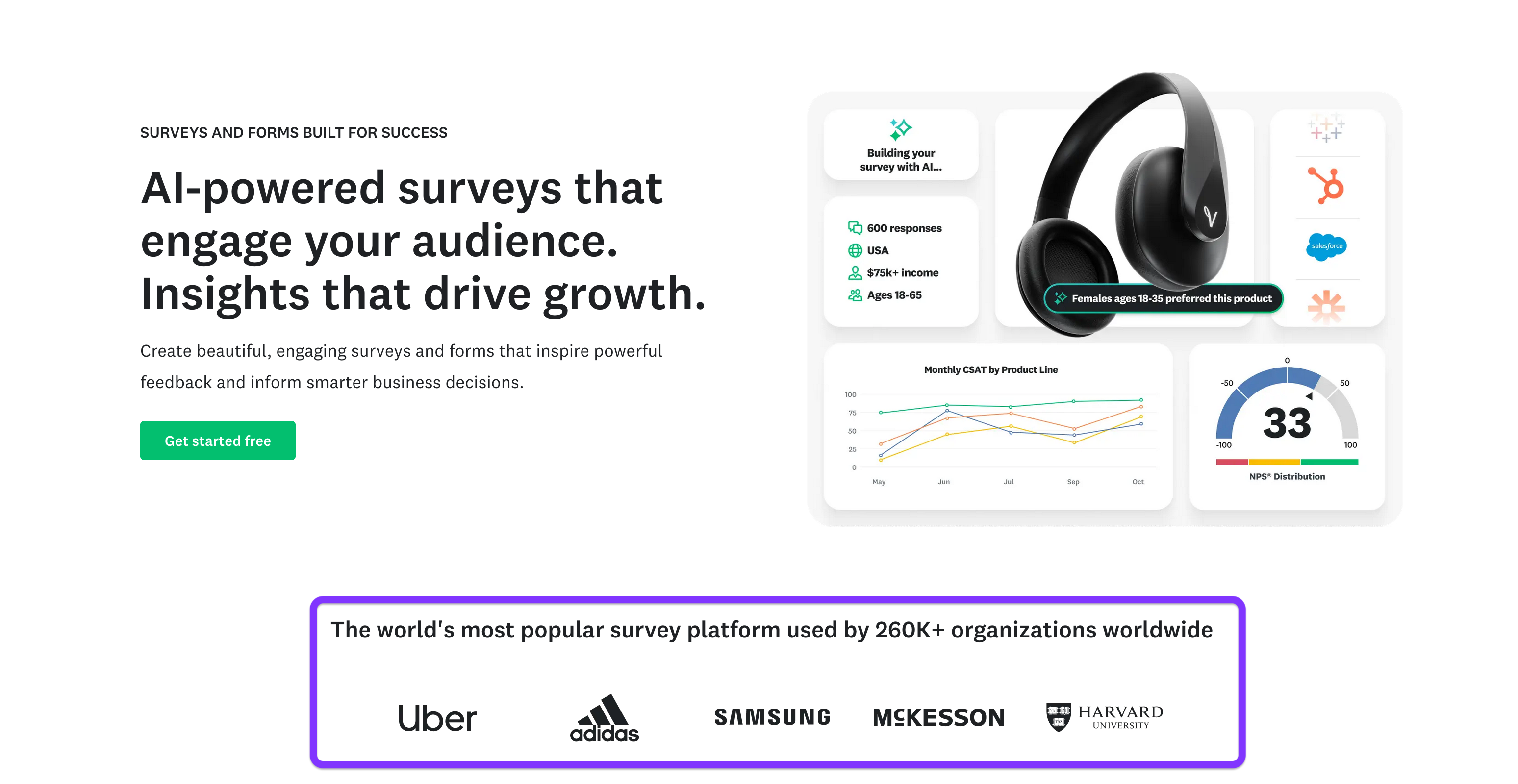 When you open the page, you're met with short copy that further assures the user that SurveyMonkey is a reliable solution. More importantly, reputable brands are included as clients above the fold, which ensures authority by association.