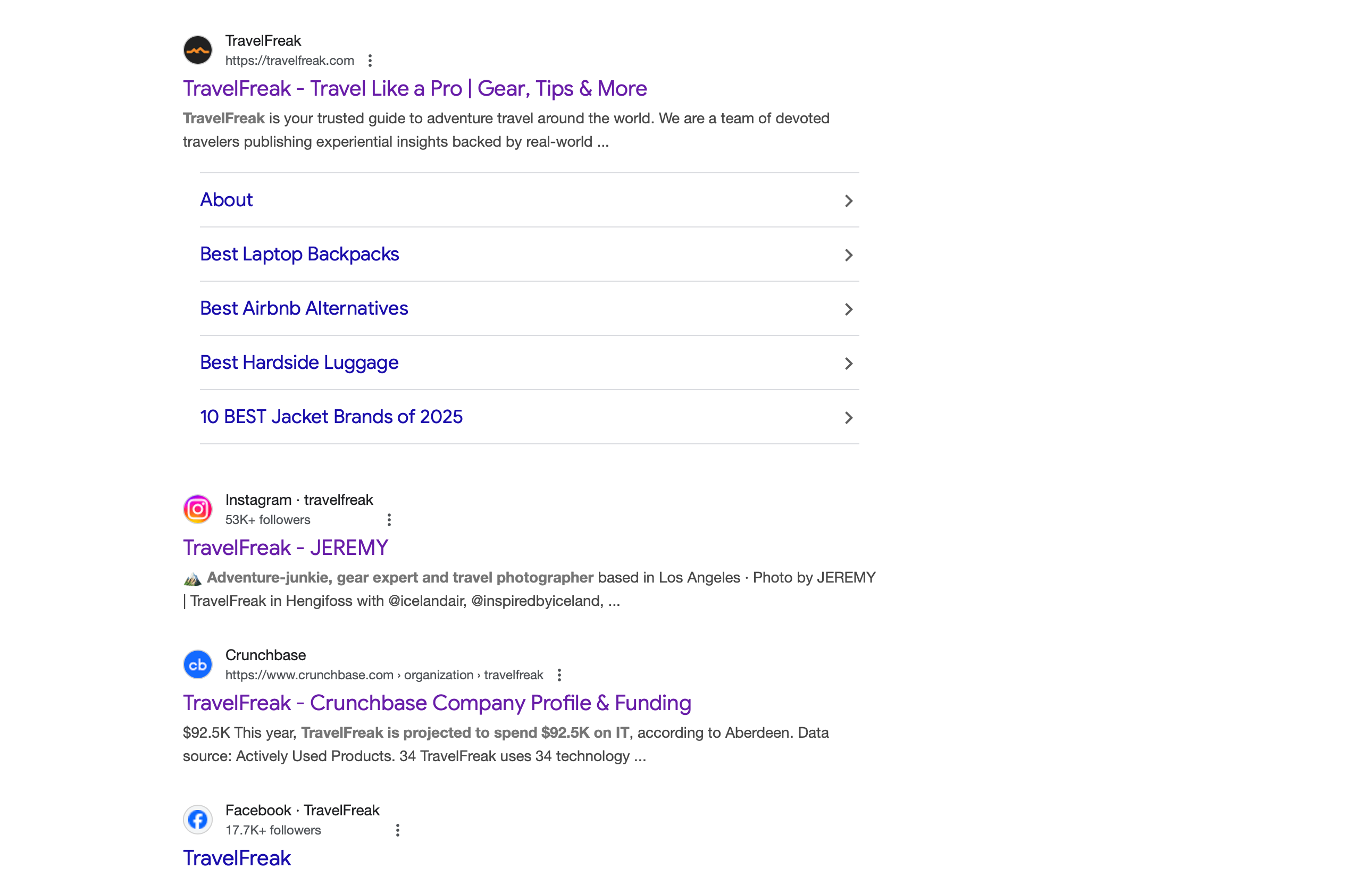 You'll probably see a mix of owned pages, social profiles, and third-party pages. For example, when I Google TravelFreak, the first page shows that mix: