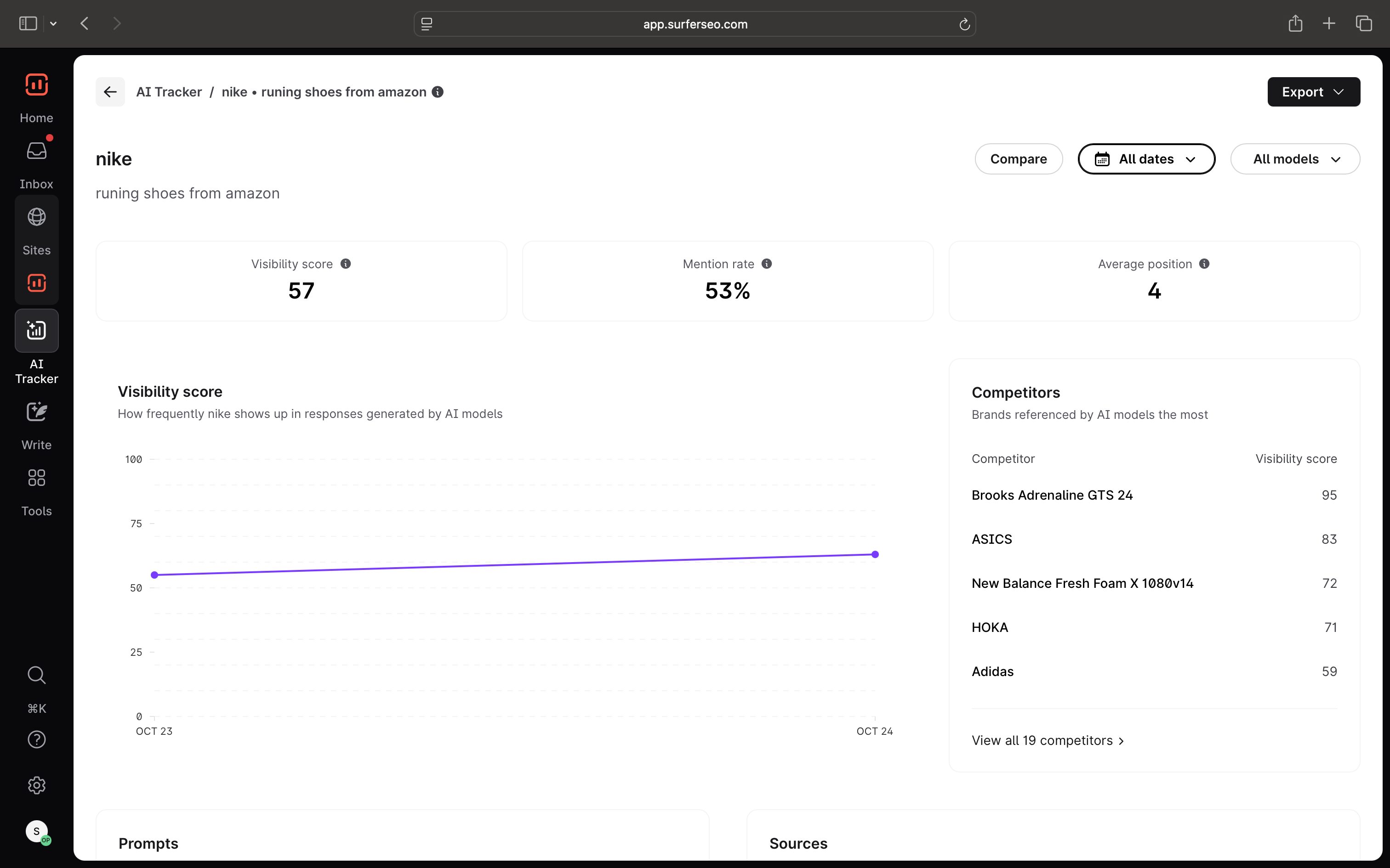 Head to Surfer AI tracker, and look at your Visibility score – an overall metric showing your brand's appearance and ranking in AI platforms like ChatGPT and Perplexity.