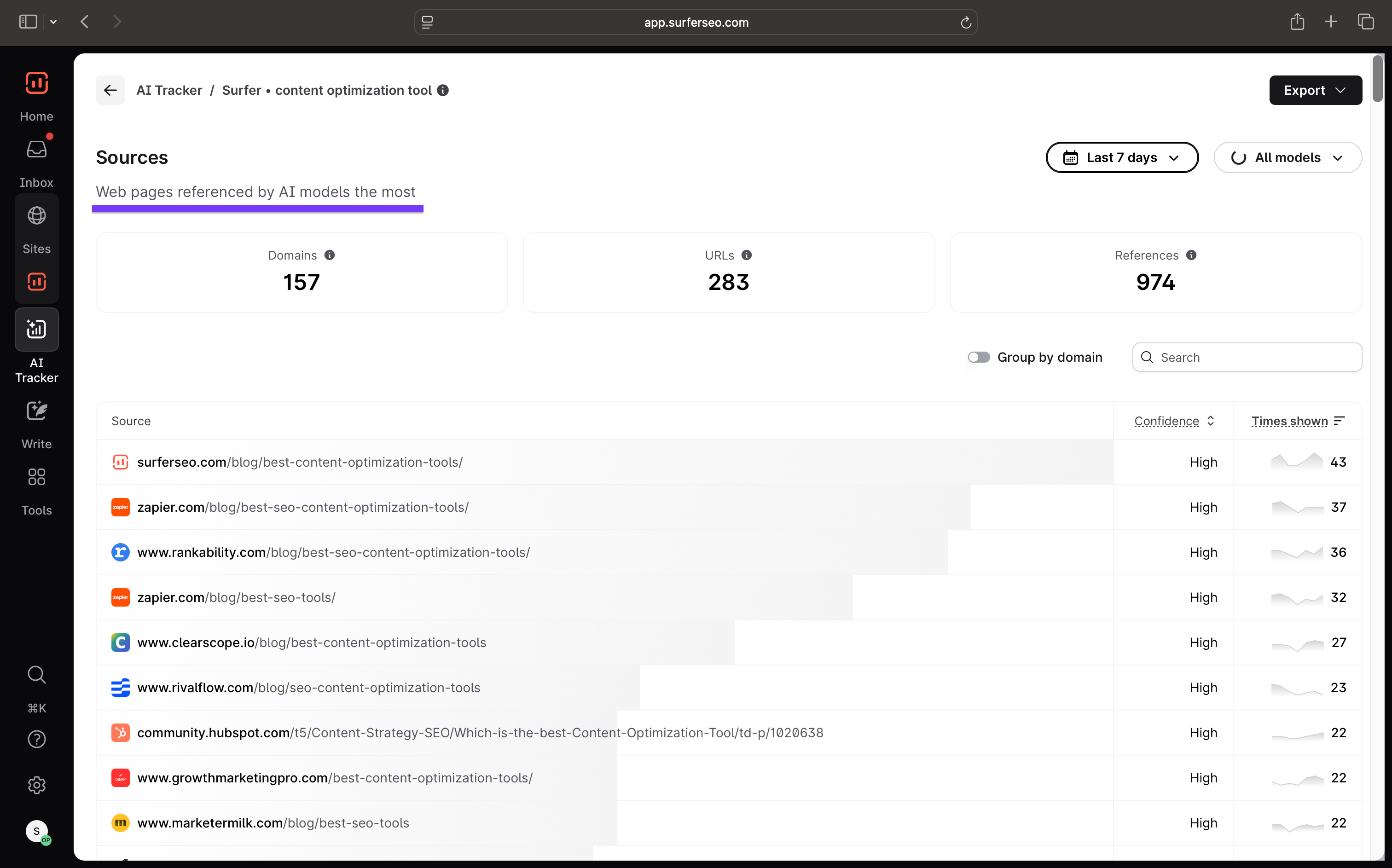 Here for example, you can see all the pages that cite Surfer as a top content optimization tool.