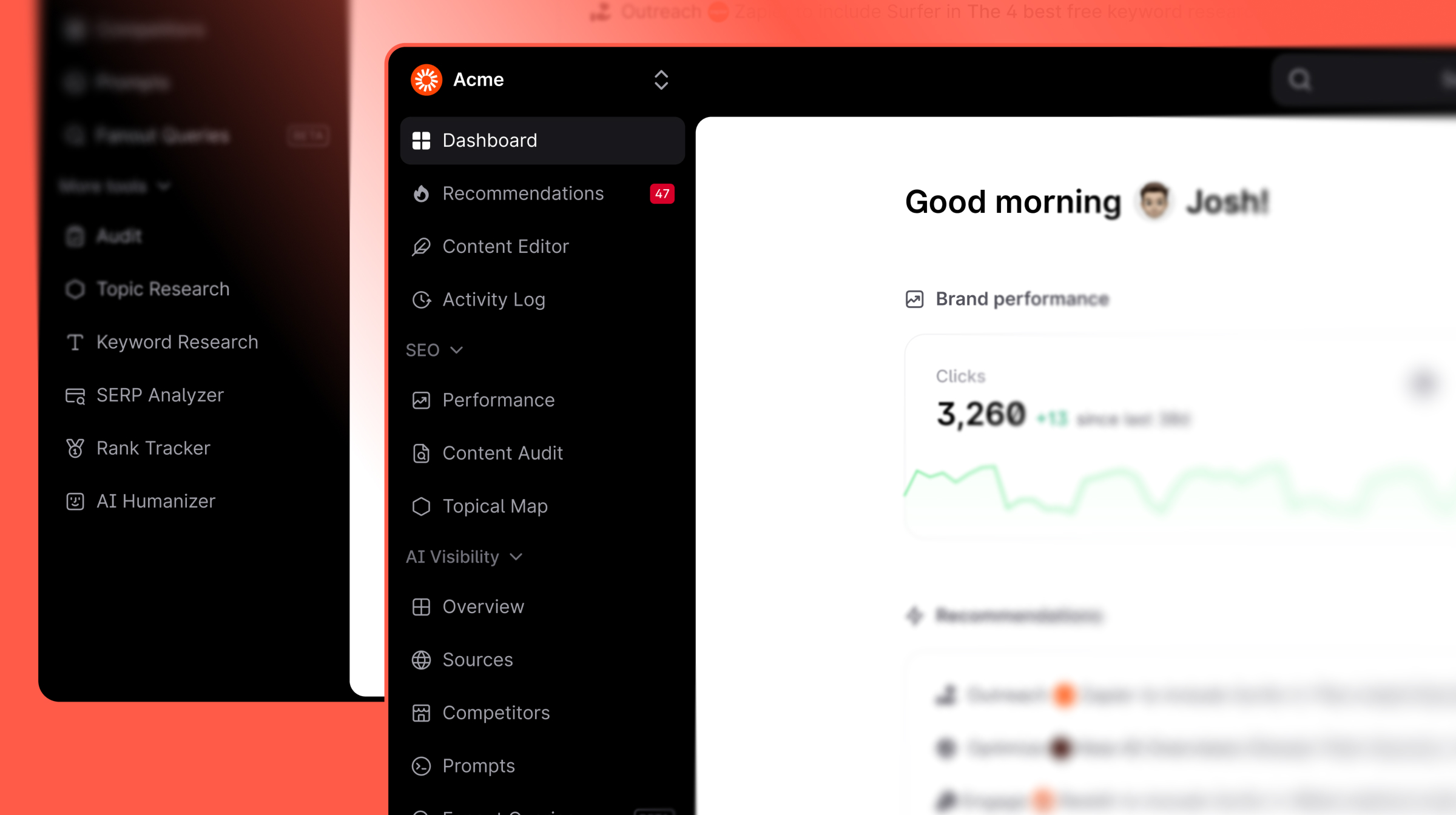 Surfer’s navigation has been completely redesigned to separate workspace management from organizational settings. With a new persistent top bar, breadcrumb navigation, and a brand-focused dashboard, users can now benchmark their performance against competitors and access their core tools faster than ever before.